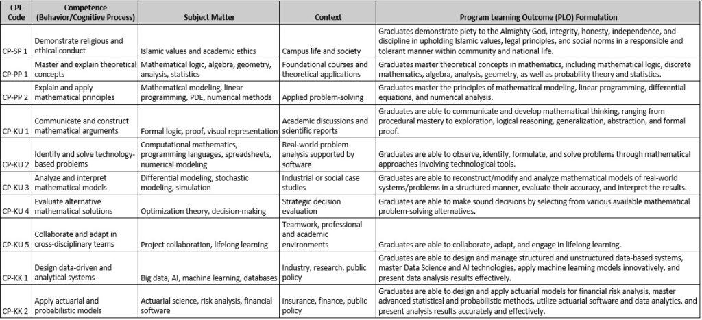 Grounded in these considerations, the OBE curriculum in the Mathematics Study Program is expected to produce academically excellent graduates with strong moral integrity who are capable of making tangible contributions to society. Its implementation is supported by the integration of digital technologies and a Learning Management System (LMS) to improve instructional effectiveness and enable a more accurate and systematic outcome-based evaluation process.