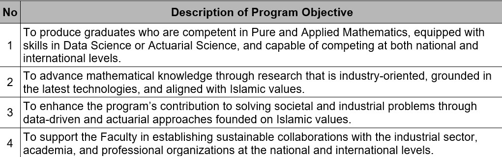 In developing its curriculum, the Mathematics Study Program, Faculty of Science and Technology, UIN Syarif Hidayatullah Jakarta, refers to the Presidential Decree of the Indonesian Mathematical Society (IndoMS) No. 028/Pres/IndoMS/SK/I/2022, dated 3 January 2022, concerning the IndoMS Recommendation for the Minimum Curriculum of Undergraduate Mathematics Programs in Indonesia. This decree provides standardized guidelines for the development of mathematics curricula that meet both national and international benchmarks, ensuring the production of graduates who are competitive across multiple sectors.
