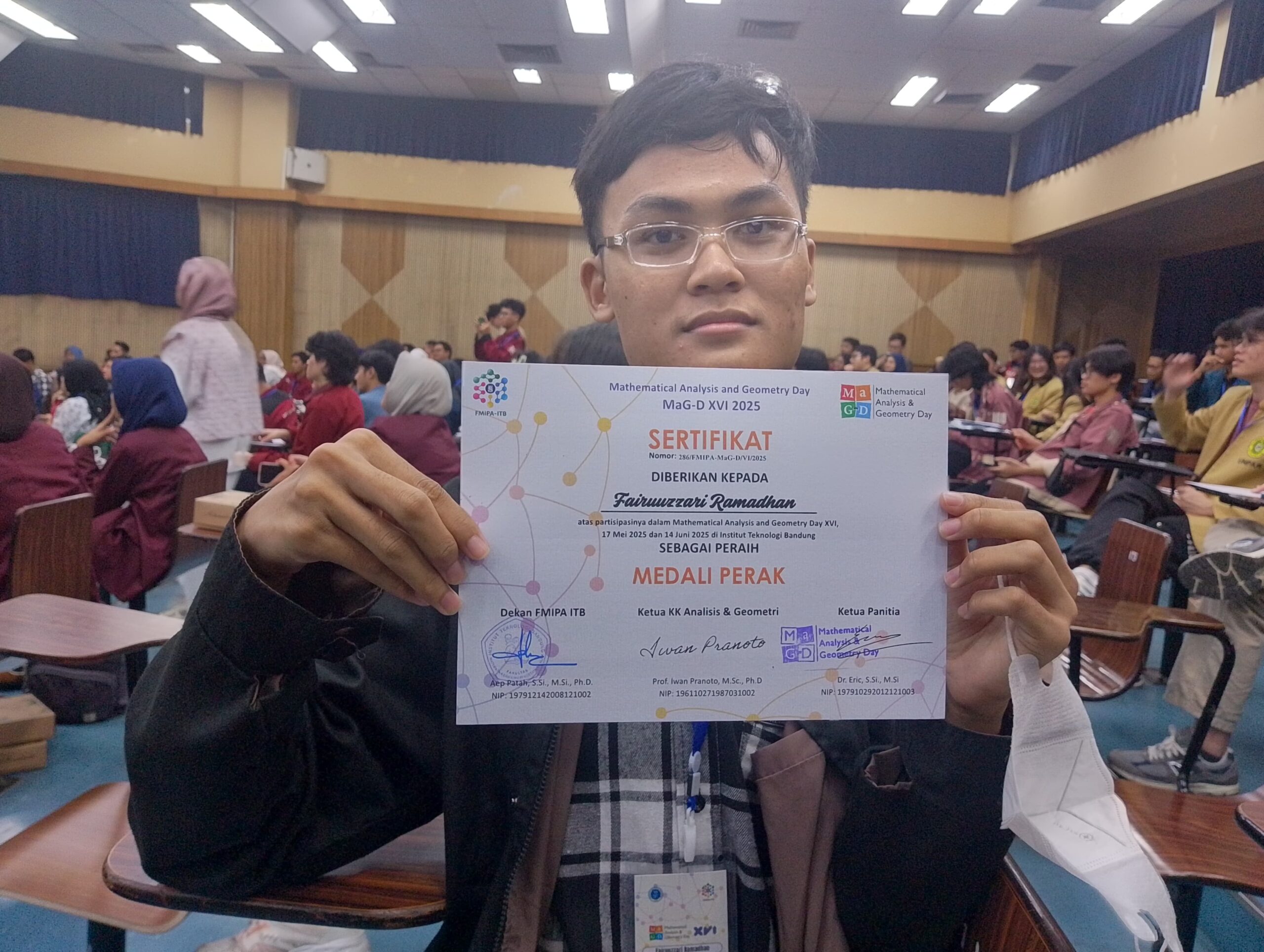 - Selamat kepada Fairuz (mahasiswa Matematika UIN angkatan 2023), pembimbing Pak Mahmudi, dan team pendukungnya atas perolehan medali perak di MaG-D ITB 🥳🎊🎉. Barakallahu, kalian hebat dan membanggakan 👍🏻🤩👍🏻